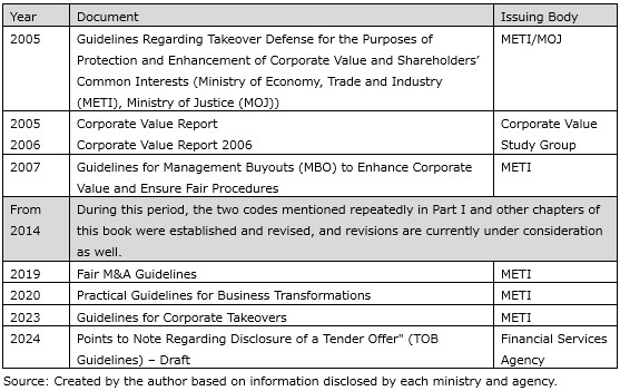 In August 2023, Ministry of Economy, Trade and Industry (METI) published Guidelines for Corporate Takeovers: Enhancing Corporate Value and Securing Shareholders’ Interests (Note 4) with the "objective of encouraging acquisitions that are favorable for the economy and society to occur in a healthily functioning fair M&A market.” The guidelines also updated similar content in previously established guidelines related to corporate acquisitions. The guidelines provide an easy-to-understand overview of the market for corporate control and policy directions outlined in this chapter. We recommend that readers of this book read them carefully.